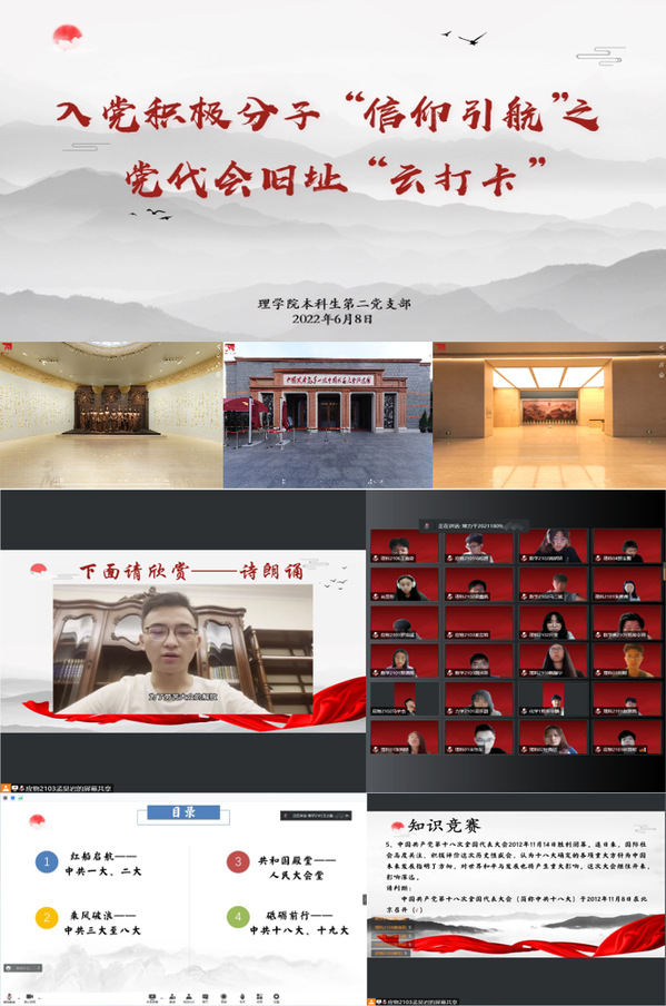本次党代会旧址“云打卡”活动包括理论宣讲、情景朗诵、知识竞答、分享感悟4个环节。会议伊始,由刘开来、国洪菲、刘俊辰、孟昊岩4名讲述人带领大家“云参观”中国共产党历次党代会部分会址,通过“云参观”红色革命基地的方式开展理论宣讲,在追寻革命先辈足迹中重温党的光辉历史,接受红色革命精神洗礼。