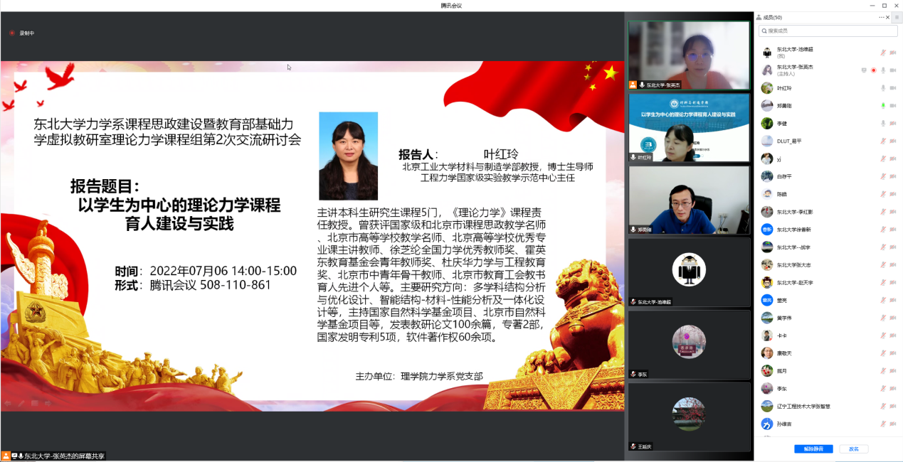 为深入贯彻新时代育人工作的新理念新战略新举措,必威体育 力学系党支部于7月6日下午,召开了东北大学力学系时代新人培育主题报告与经验交流研讨会。本次会议通过腾讯会议在云端开展,由力学系党支部书记张英杰主持。出席本次会议的老师包括特邀嘉宾——国家级和北京市课程思政教学名师北京工业大学的叶红玲教授,必威体育-必威体育app 副院长李健教授、力学系主任李东教授、工程结构动力学中心执行主任王延庆教授,虚拟教研室副主任大连理工大学郑勇刚教授,理论力学课程组副组长、山东大学王少伟教授、郑州大学徐文涛副教授、新疆大学吴晓教授,大连理工大学力学系副主任阎军教授以及东北大学力学系和虚拟教研室的各位专家。