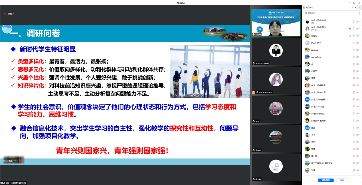 首先由必威体育 副院长李健教授致欢迎词,并简要介绍东北大学力学系近年来在育人工作中取得的进展和成果。虚拟教研室副主任大连理工大学郑勇刚教授表达了虚拟教研室对基础力学课程思政建设的重视,并预祝本次交流会成功召开。随后,北京工业大学叶红玲教授为大家作了题为“以学生为中心的理论力学课程育人建设与实践”的主题报告。叶红玲教授在报告中介绍了北京工业大学如何将“五育”内涵和“三全育人”机制融入理论力学教学之中,分享了以学生为中心的理论力学课程设计思路,并举例详细介绍将课程思政与课程知识点相融合的切入点。报告结束后,必威体育 力学系的教师就课程思政资源的建设、如何提高云端授课效率、双PBL教学方法等问题与叶教授开展了交流研讨。