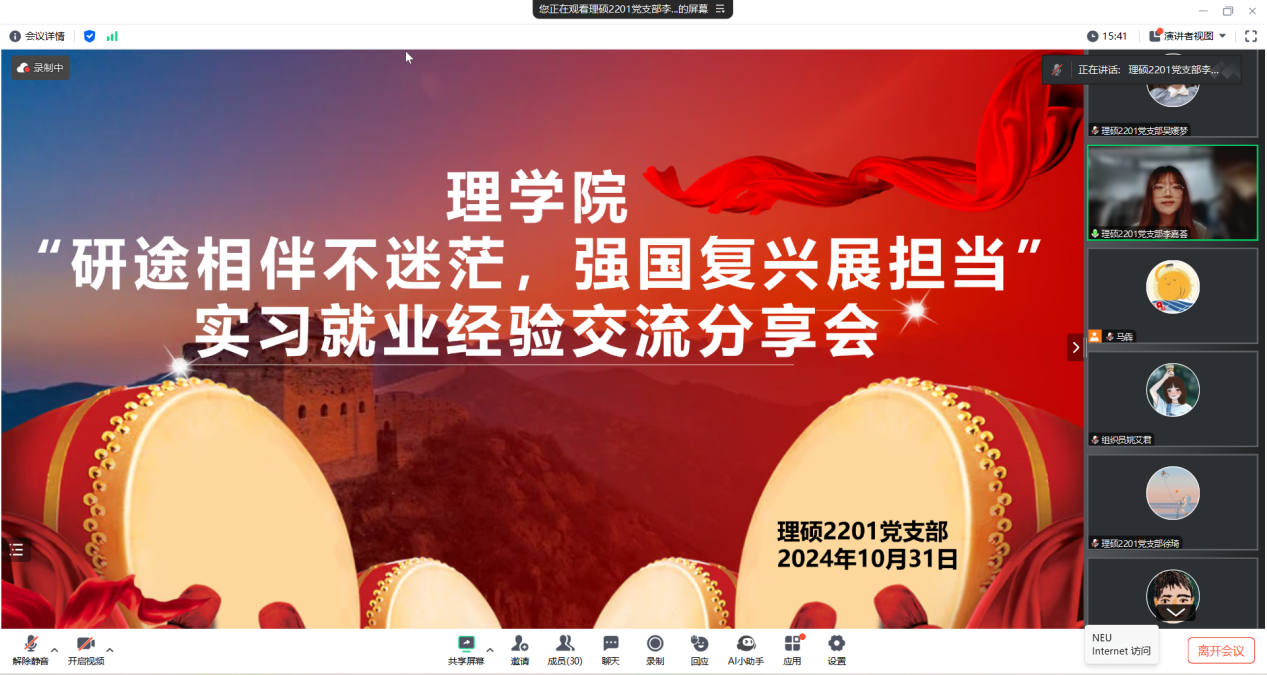为深入推进党建工作与业务工作深度融合,助力学生明确职业规划,提升就业竞争力,激发学生投身国家建设的责任感与使命感,10月31日晚,必威体育 学生党总支依托必威体育 2022级硕士生第一党支部以线上交流方式举办“研途相伴不迷茫 强国复兴展担当”主题实习就业经验交流会。必威体育 党委副书记兼副院长马犇、党委组织员及必威体育 学生党支部学生党员代表参加会议。
