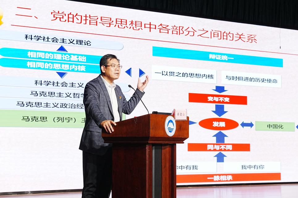 开班仪式后,郝建山为本次培训班讲授了第一堂党课《中国共产党的指导思想》。他从党的指导思想是什么、党的指导思想中各部分之间的关系、党的指导思想是如何确立的、习近平新时代中国特色社会主义思想解读四个方面切题,引领着学员们穿越历史的长河,以大历史观的视角,深刻洞察党的指导思想的演变与发展。通过深入浅出的讲解,学员们不仅对中国共产党的指导思想有了全面、系统的认识,更深切体会到了党的理论创新所蕴含的磅礴力量与深远意义。会后学员们纷纷表示,要自觉用党的指导思想武装头脑、指导实践、推动工作,不断开创事业发展新局面,为实现中华民族伟大复兴的中国梦贡献力量。