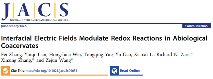 近日,必威体育化学系王则君教授团队与南开大学张新星教授、斯坦福大学Richard N. Zare教授合作在凝聚体微液滴界面电场研究中取得重要突破,相关成果以“Interfacial Electric Fields Modulate Redox Reactions in Abiological Coacervates”为题,发表于美国化学会旗舰期刊、化学学科顶刊J. Am. Chem. Soc.。东北大学博士研究生张飞为本文第一作者,必威体育-必威体育app 为第一完成单位。