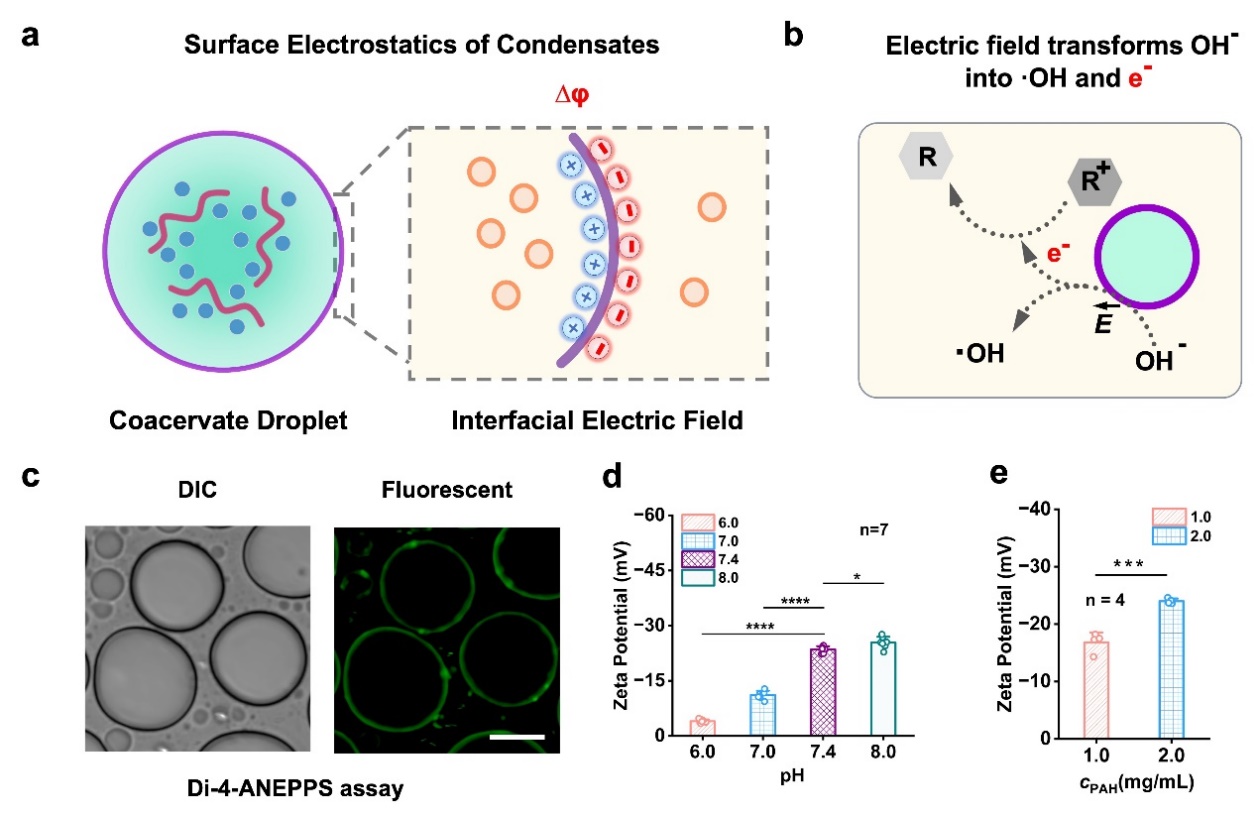 液-液相分离(LLPS)形成的生物分子凝聚体的表面产生可以驱动氧化还原反应的界面电场(IEFs)。这一电化学行为是生物系统所独有的吗?为了回答这一问题,团队利用聚(丙烯胺盐酸盐)与腺苷-5'-三磷酸二钠盐(PAH-ATP)聚阳离子电解质-阴离子对构建凝聚体模型。通过电压敏感荧光探针检测发现,PAH-ATP凝聚体微液表界面存在显著界面电场(IEF),该IEF能有效将氢氧根离子(OH⁻)撕裂为电子(e⁻)和羟基自由基(•OH)。这些发现表明,由LLPS凝聚体驱动的电化学功能不仅限于生物学领域,还可应用于可被设计的人工非生物系统。